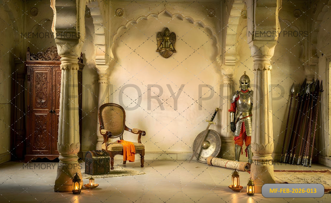 MAJESTIC RAJASTHANI PALACE ARMORY WITH SUIT OF ARMOR, THRONE CHAIR, AND ANCIENT WEAPONS - PRINTED BACKDROP