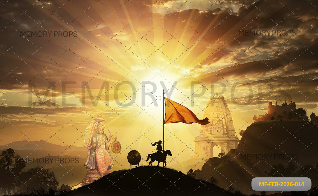 MAJESTIC HINDU DEVOTIONAL BACKDROP WITH SILHOUETTE WARRIOR, TEMPLE, AND RADIANT SUNSET - PRINTED BACKDROP