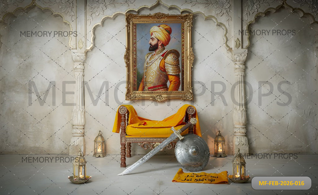 REGAL MARATHA HERITAGE SET WITH CHHATRAPATI SHIVAJI MAHARAJ PORTRAIT, SWORD, AND SHIELD - PRINTED BACKDROP