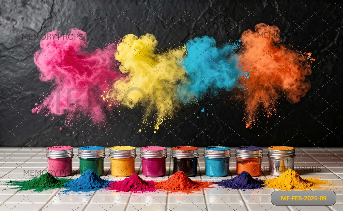 VIBRANT HOLI ART STUDIO WITH MULTICOLOR PAINT SPLASHES, PAPER ROSETTES, AND GULAL BOWLS - PRINTED BACKDROP