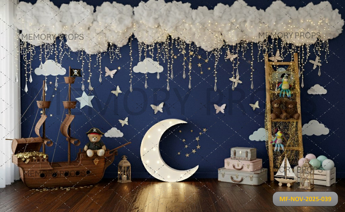 NAVY BLUE PIRATE SHIP AND STAR NIGHT - PRINTED BACKDROP