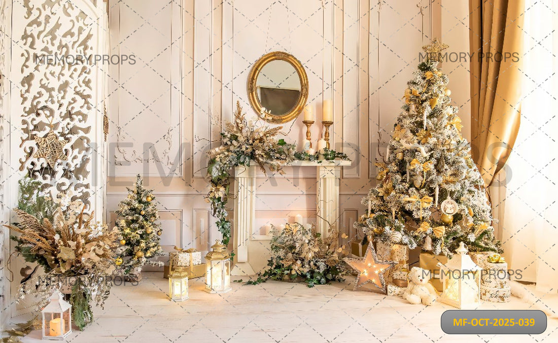 GOLD AND CREAM CHRISTMAS MANTEL - PRINTED BACKDROP