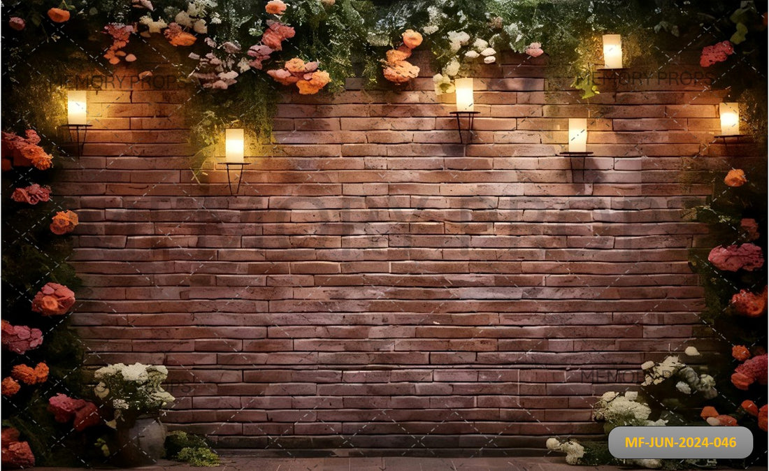 A red rose brick wall backdrop blends the beauty of vibrant red roses with the...