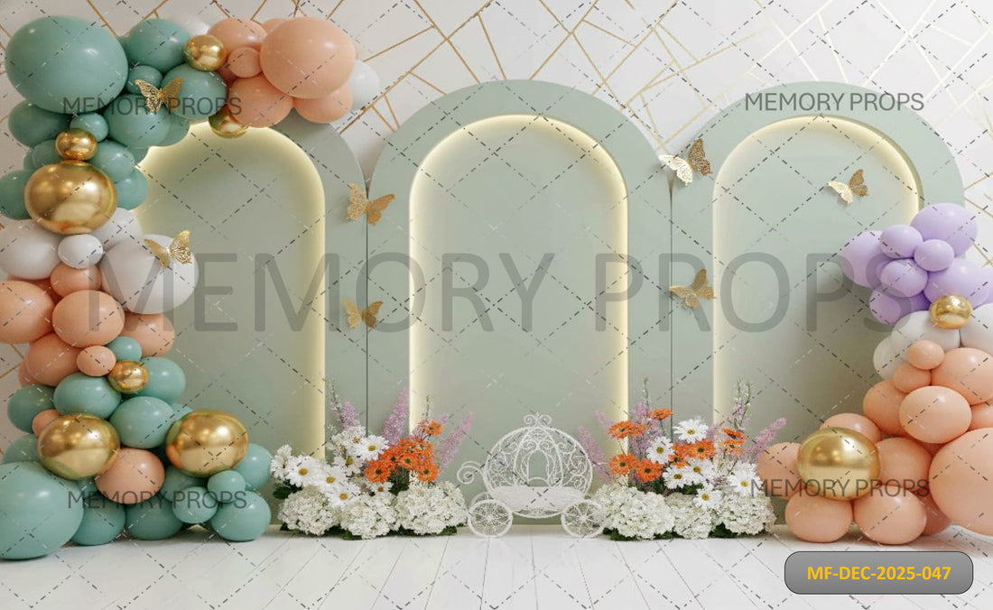 MINT GREEN TRIPLE ARCH WITH PEACH BALLOONS AND CINDERELLA CARRIAGE - PRINTED BACKDROP