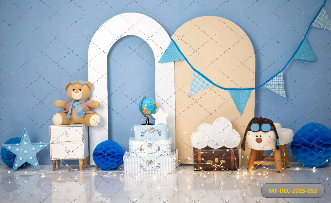 LITTLE PILOT BLUE BACKDROP WITH TEDDY BEAR AND VINTAGE SUITCASES - PRINTED BACKDROP
