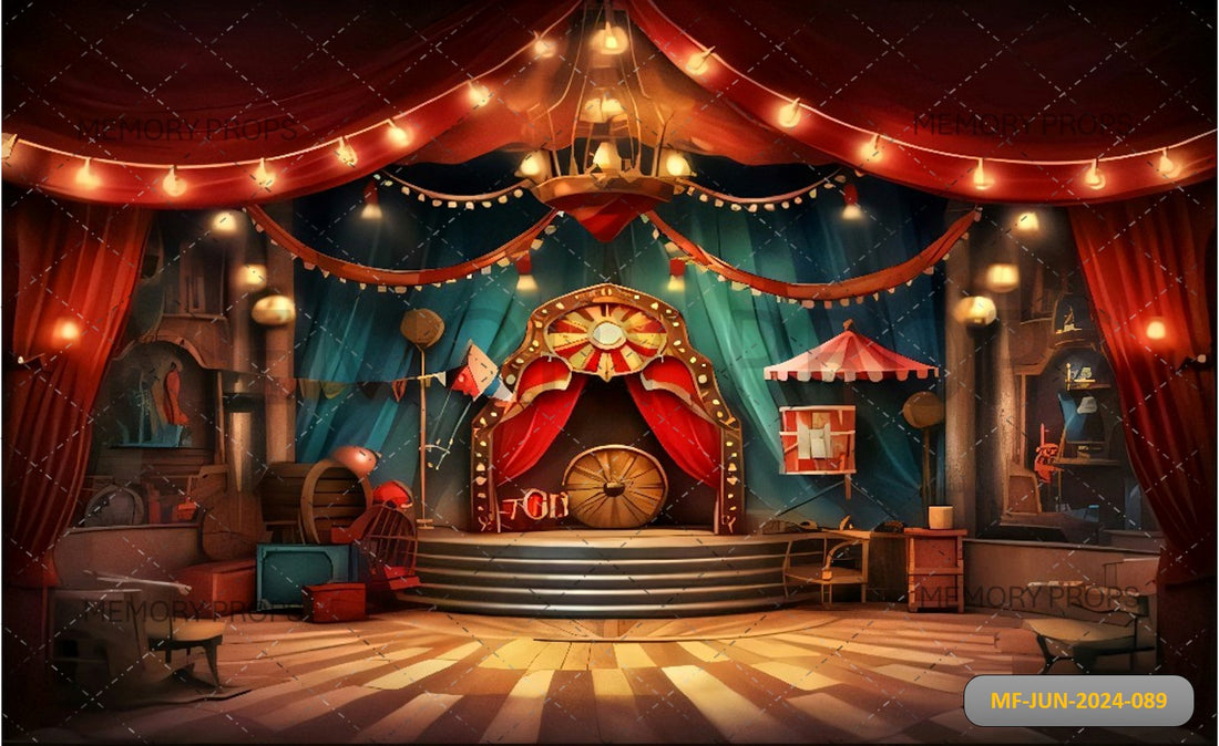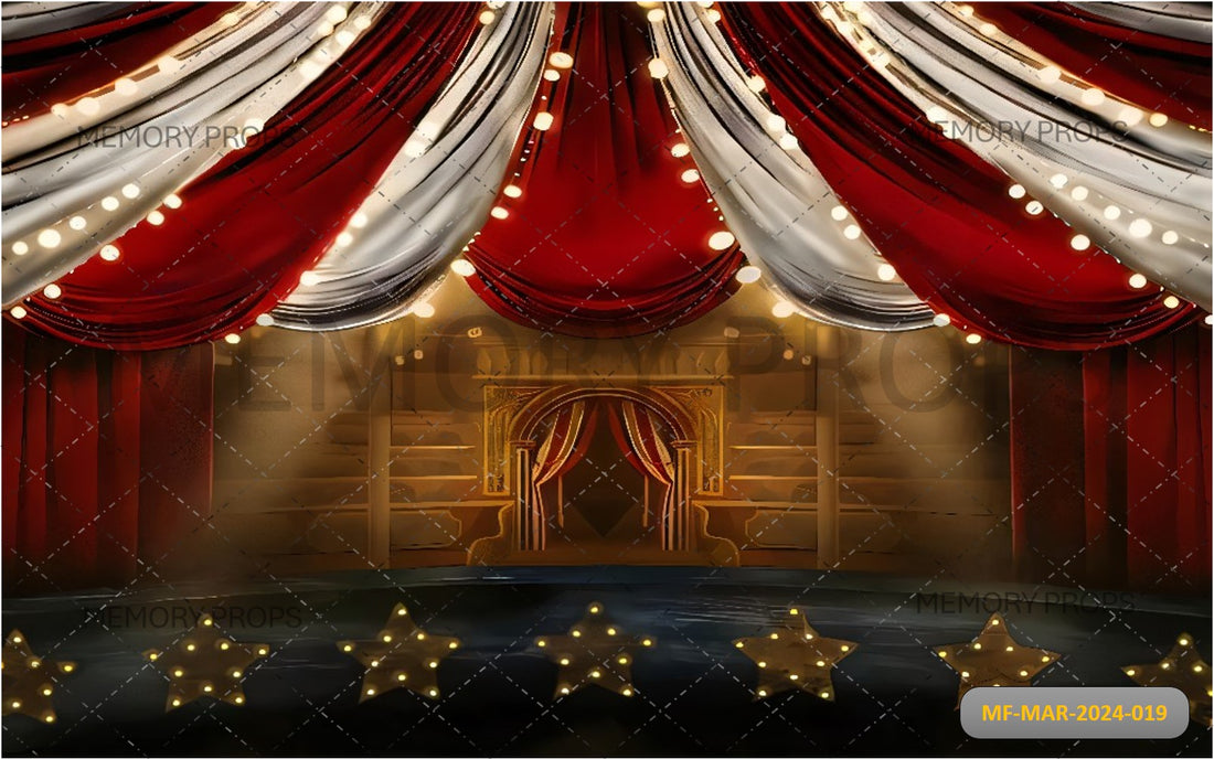 A circus curtain tent stage is draped in vibrant red and gold fabric, with twinkling...
