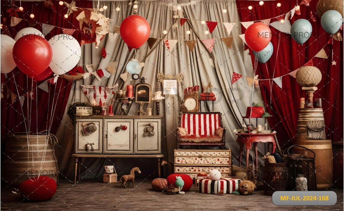 Vibrant circus backdrop with balloons and stars for a playful studio shoot.