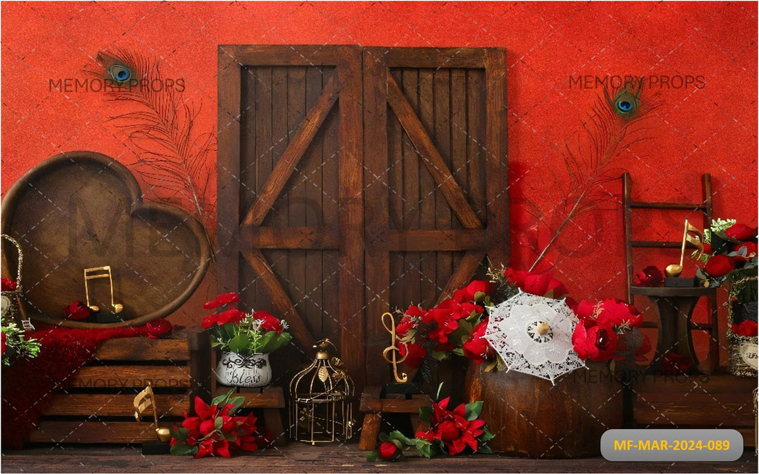 RED HEART BASKET WITH DOOR AND FLOWERS PRINTED BACKDROP