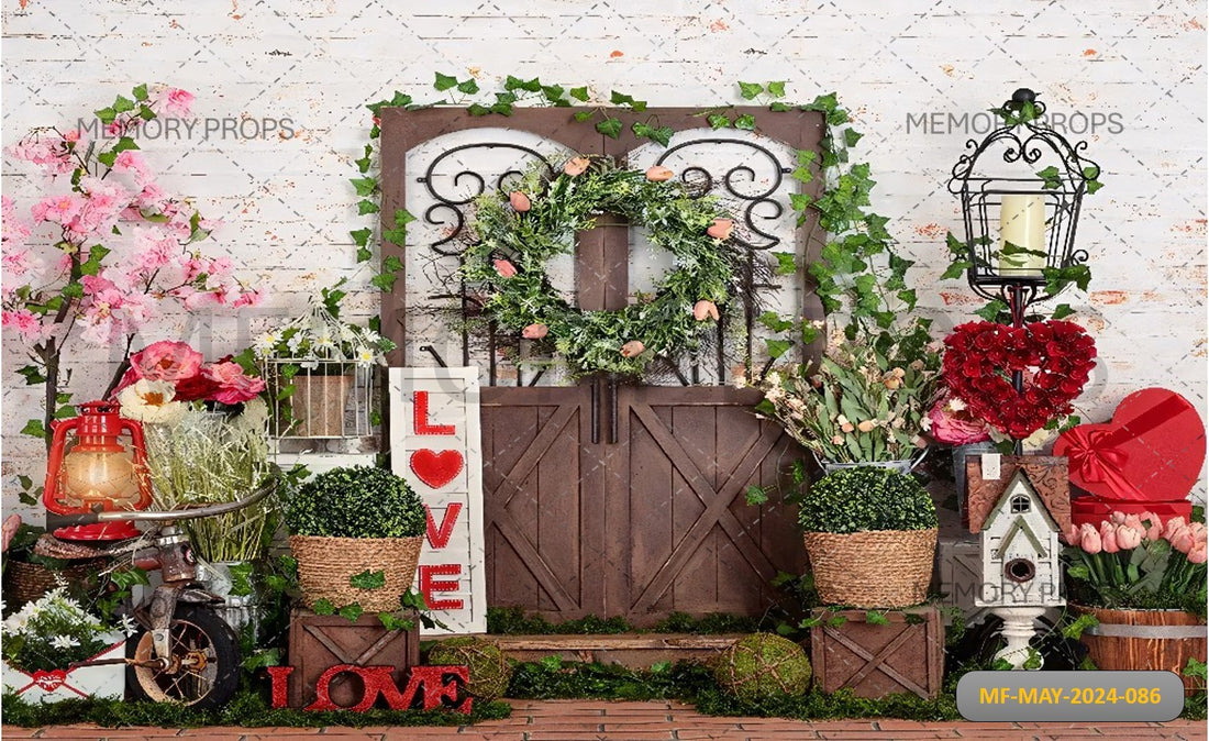 DOOR RED ROSE WITH LOVE HEARTS BRICK WALL PRINTED BACKDROP