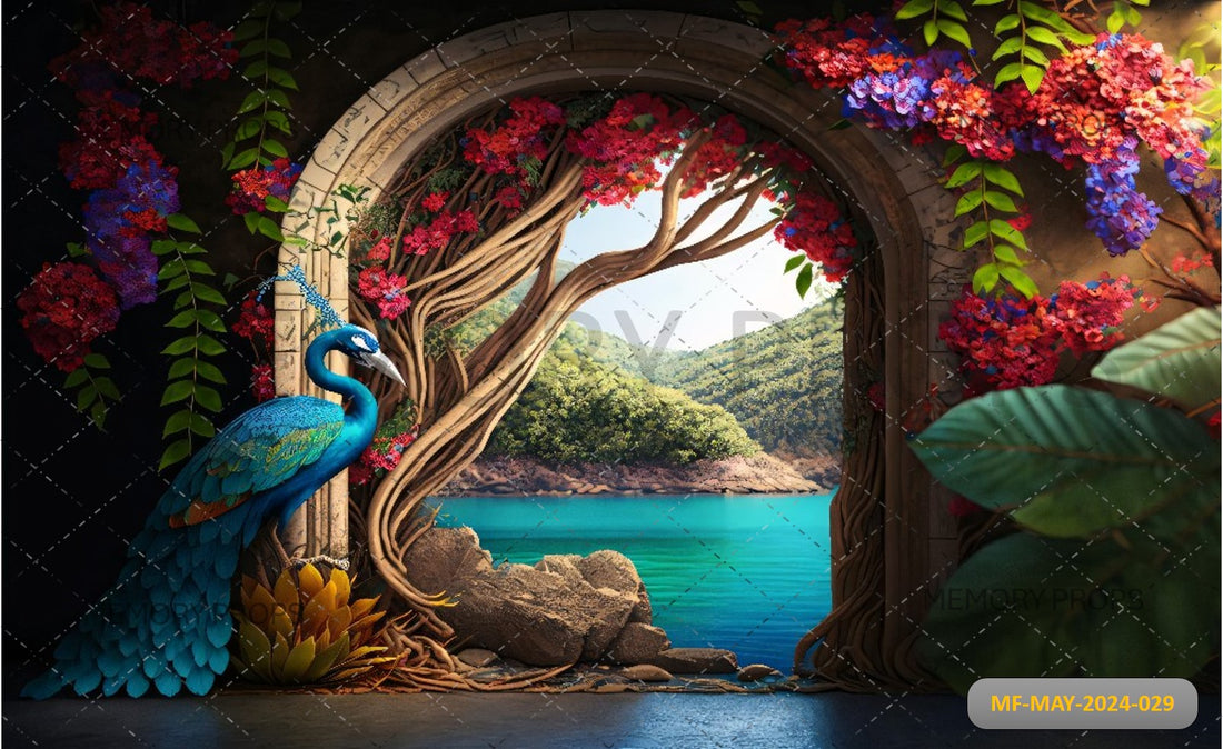 LANDSCAPE WITH BLUE PEACOCK AND FLOWERS - PRINTED BACKDROPS