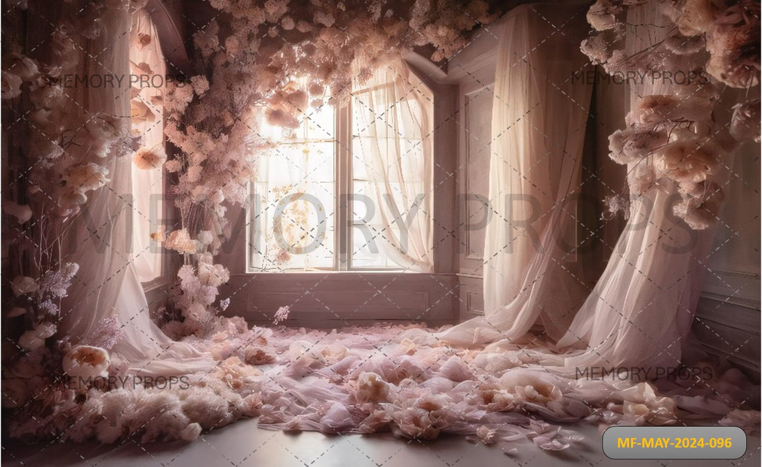 Imagine a peaceful room with a large window framed by soft, flowing pink curtains that...
