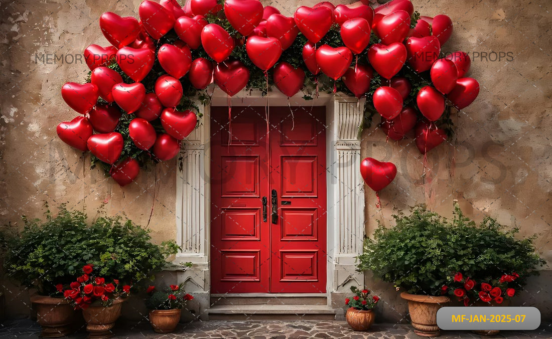 Create a stunning scene with our Red Balloon Hearts on the Wall backdrop, perfect for...