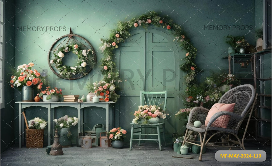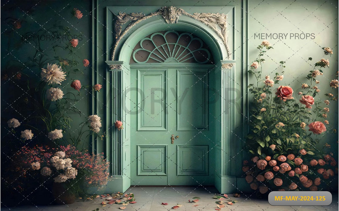 ROOM WITH A GREEN DOOR AND FLOWERS PRINTED BACKDROP