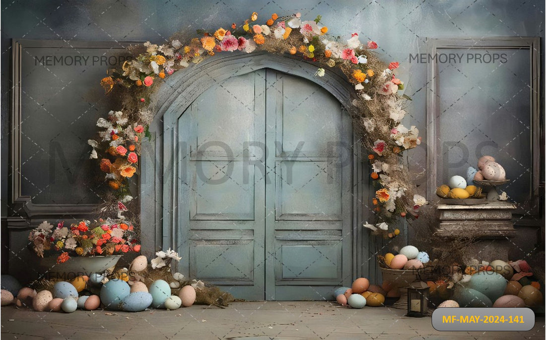 WOODEN DOOR WITH FLOWERS AND EGGS PRINTED BACKDROP