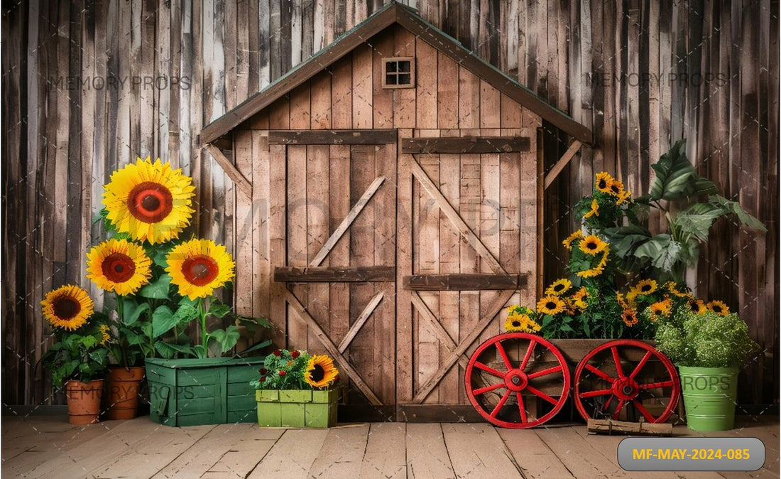 WOODEN BARN WITH SUNFLOWERS PRINTED BACKDROP