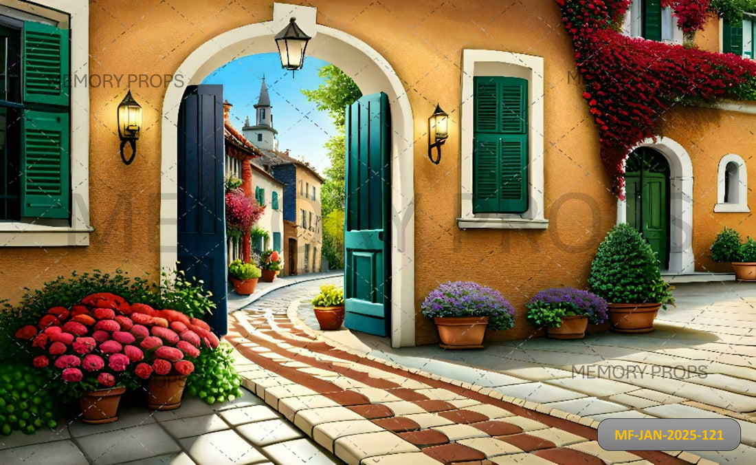 Step into a picturesque setting with our Street with Flowers and Green Doors Printed Backdrops....