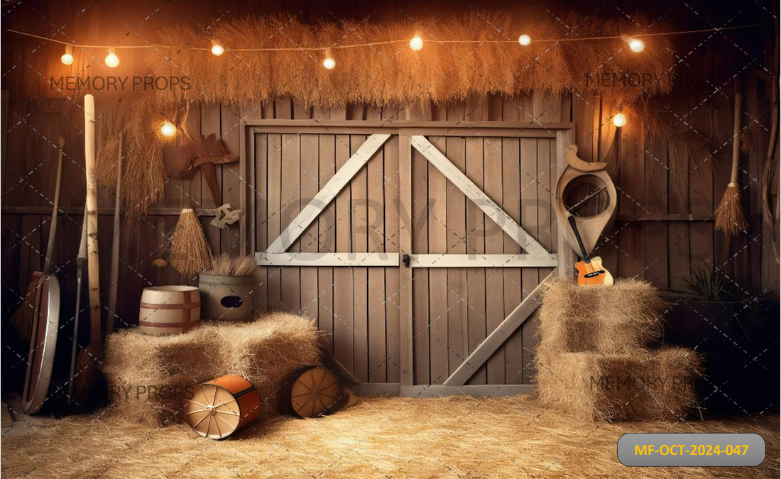 ARAFED HAY BALES AND A WHEEL IN BARN DOOR - PRINTED BACKDROPS