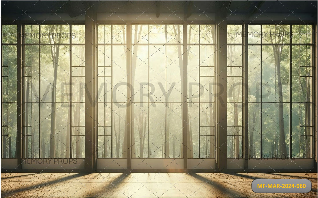 INTERIOR OF SPACIOUS EMPTY ROOM WITH WINDOWS PRINTED BACKDROP
