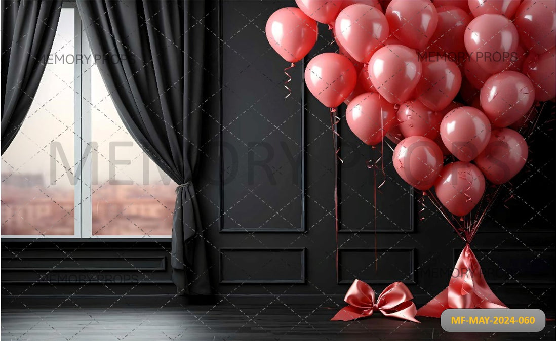 EMPTY BLACK WINDOW CURTAIN WITH BALLOONS VALENTINES - PRINTED BACKDROPS