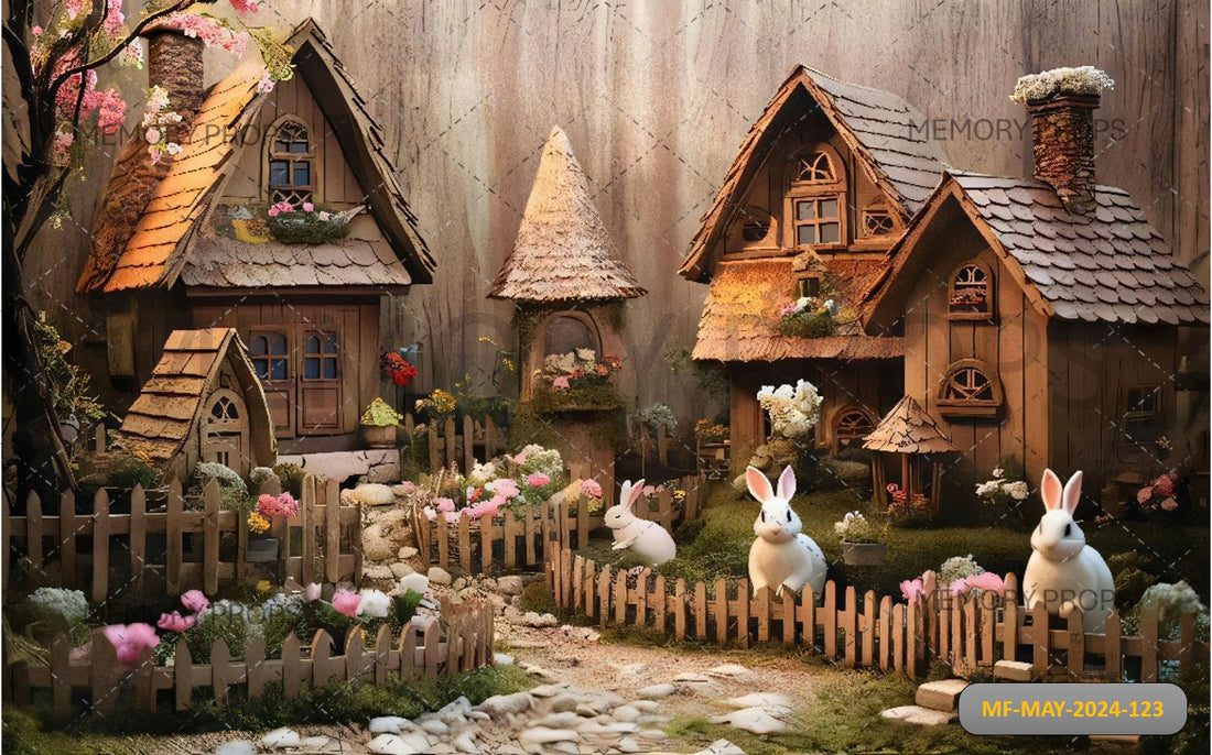RABBIT HOUSE AND FLOWERS GARDEN PRINTED BACKDROP