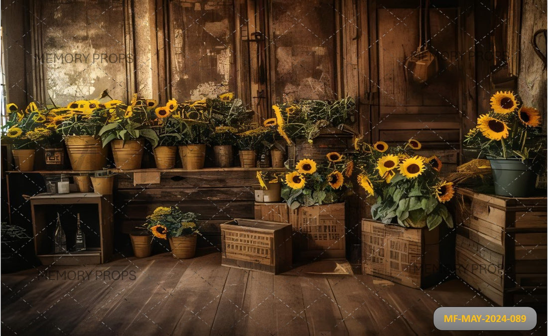 ROOM WITH A BUNCH OF SUNFLOWERS IN A BARN PRINTED BACKDROP