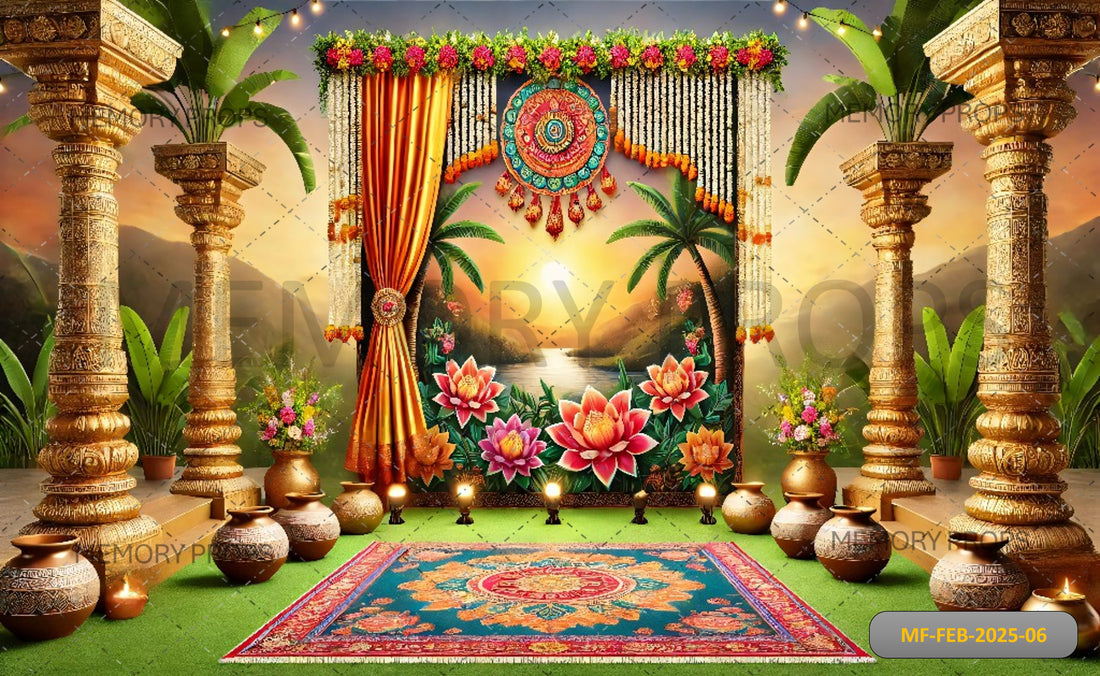 Create a majestic setting with the Royal Heritage Mandap Printed Backdrop a grand and intricately...