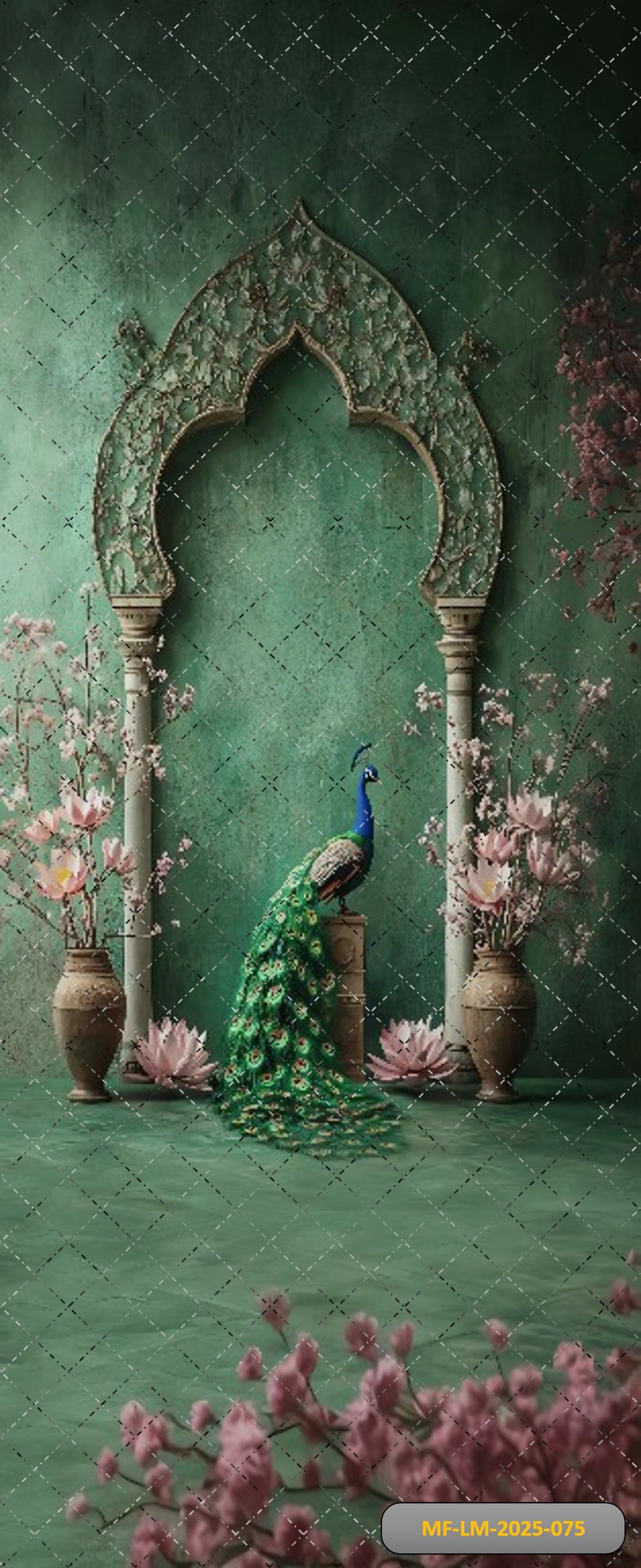 An opulent backdrop inspired by Mughal architecture, featuring grand arches, intricate jali patterns, and lush...