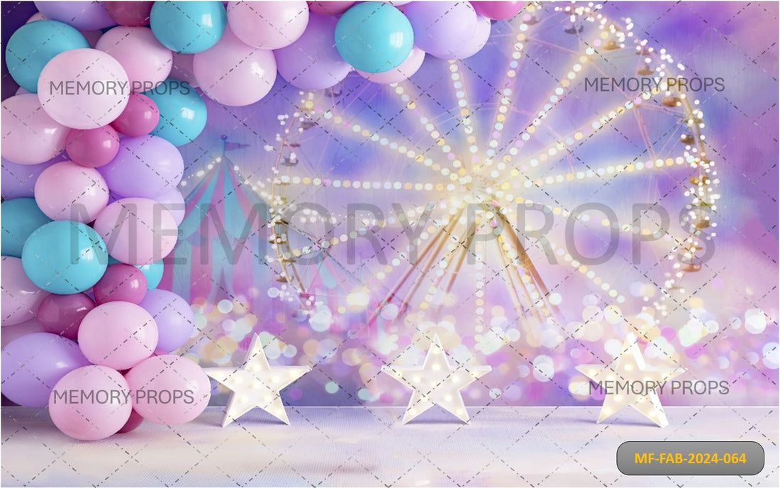 Vibrant circus backdrop with balloons and stars for a playful studio shoot.