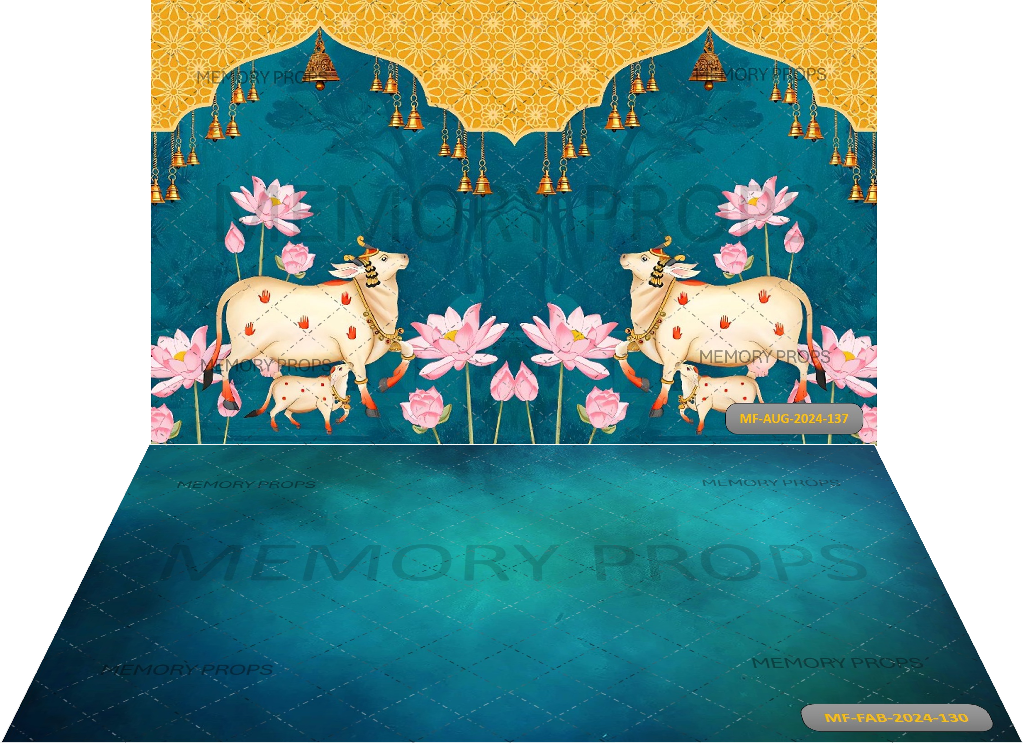 Pichwai cow art backdrop with a green texture creates a traditional and artistic atmosphere. The...