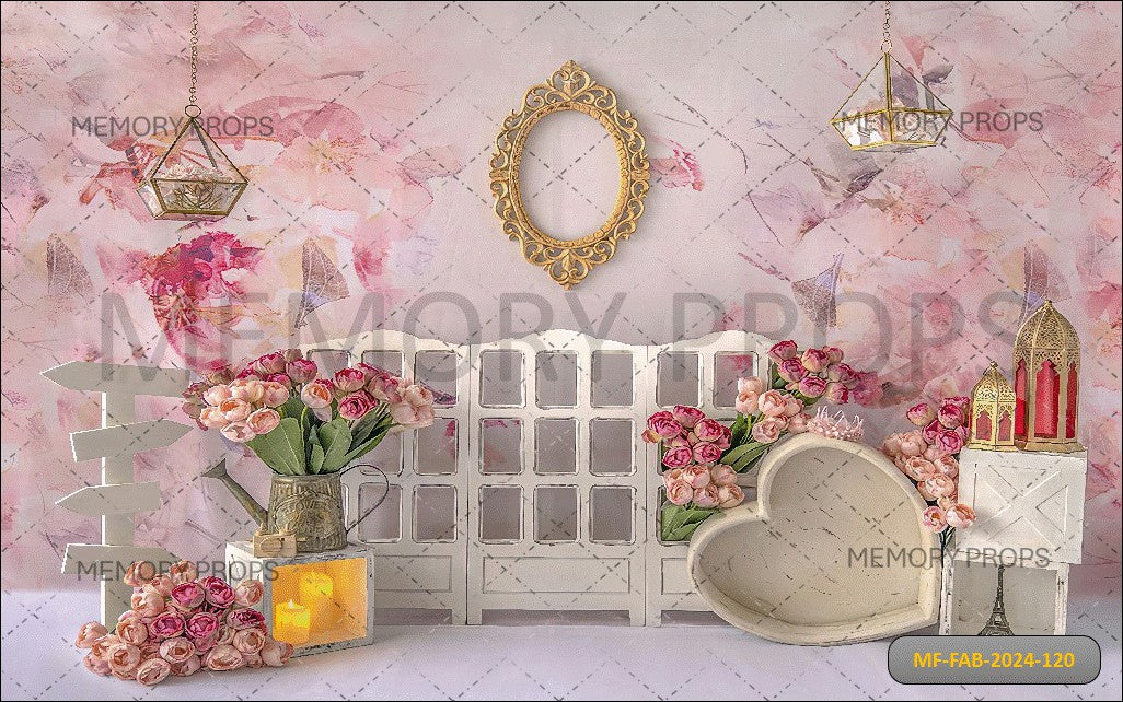 Charming backdrop with a pink and white floral barn door for a stylish studio shoot....