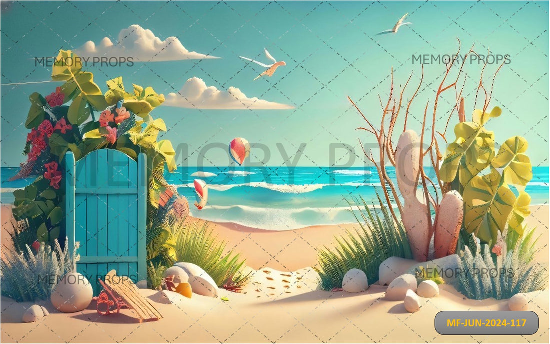 Lively printed backdrop featuring a vibrant beach scene with golden sand, clear blue waves, and...