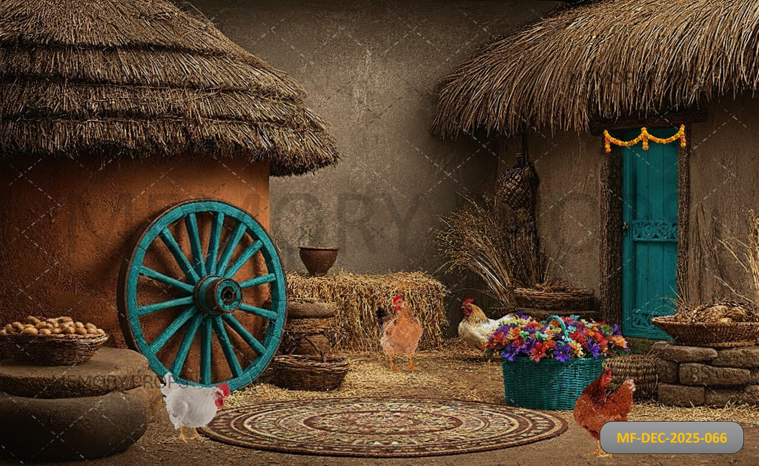 Create a warm countryside atmosphere with the Rustic Farm Village with Thatched Roofs Printed Backdrop....