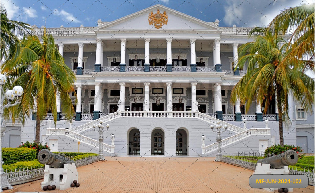 A vibrant printed backdrop depicting a classic Rajasthani courtyard with authentic architectural elements. Ornate arches,...