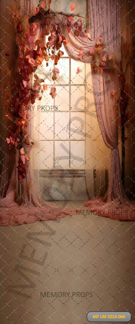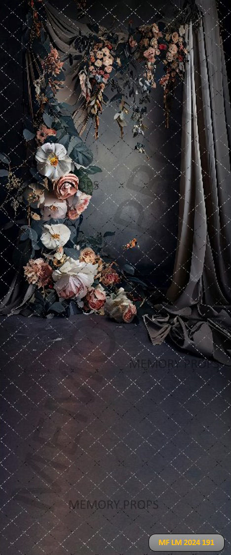DARK VINTAGE WALL DECORATED WITH SILK CURTAINS AND FLOWERS - PRINTED BACKDROP