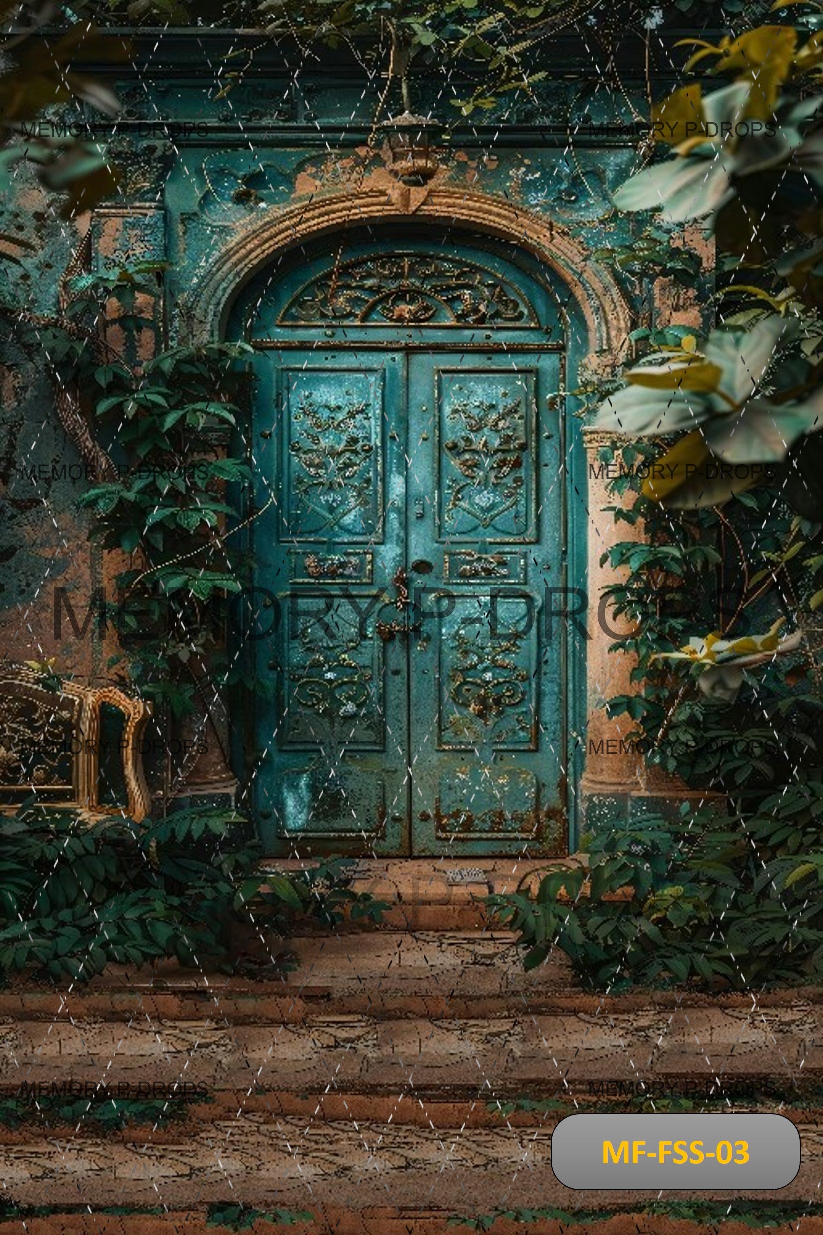 Enhance your visuals with a green door featuring an elegant leaf design on the outside, crafted with vertical joint backdrops and seamless stitch joints for a polished, natural aesthetic, perfect for photography and themed events.