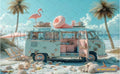 Cruise into coastal fun with this retro van parked by the beach, surrounded by surfboards, palm trees, and ocean vibes—perfect for summer shoots, tropical parties, and laid-back celebrations.