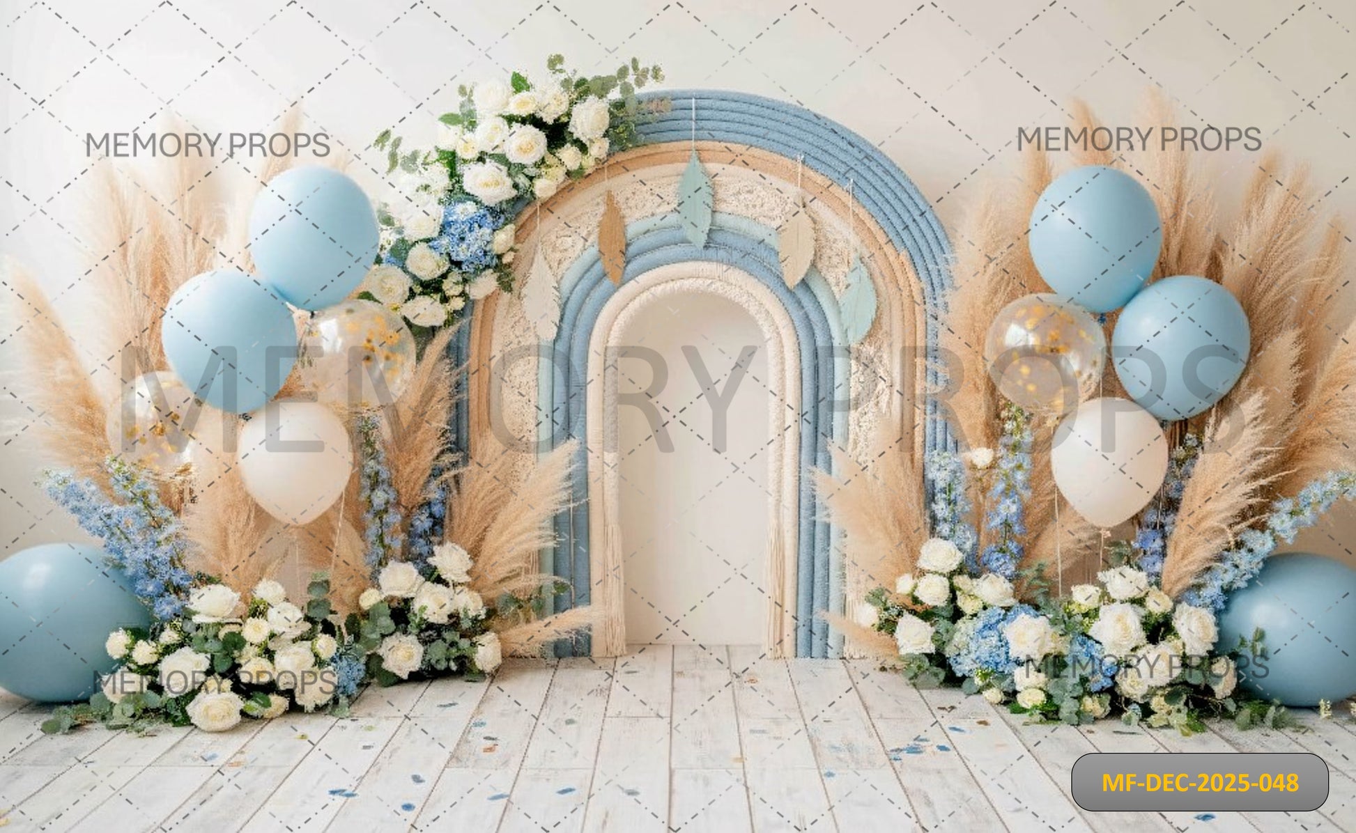 BOHO BLUE AND CREAM MACRAMÉ RAINBOW WITH PAMPAS GRASS AND BALLOONS - PRINTED BACKDROP
