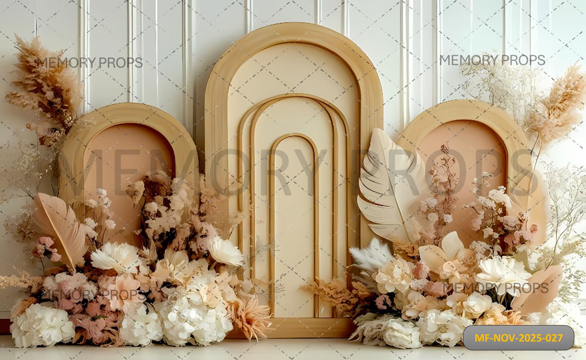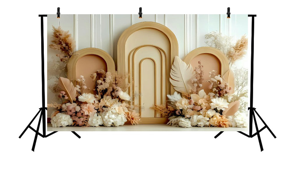 Create a warm and modern aesthetic with this Boho Neutral Arches and Pampas Grass backdrop. Designed in soothing beige and cream tones, it features layered abstract arches, soft textured elements, and natural pampas arrangements that add depth and sophistication. Perfect for baby showers, birthday sessions, maternity shoots, and minimalist décor themes, this backdrop brings a calm, earthy, and stylish bohemian vibe to any event or photoshoot.