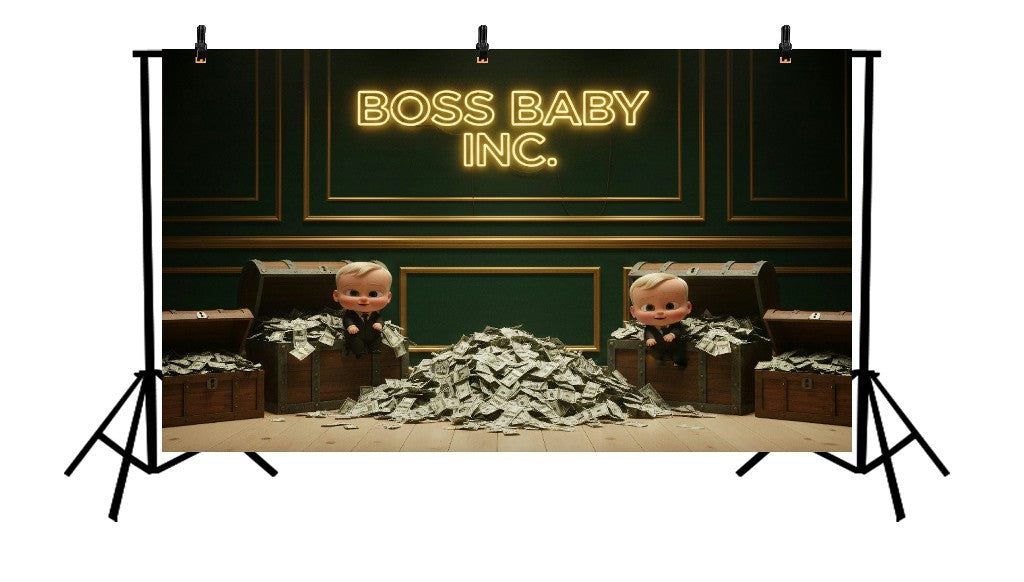 Bring fun, money-themed excitement to your party with the Boss Baby Inc. Green Wall with Treasure Chests and Cash Printed Backdrop. Featuring a bold green backdrop inspired by the Boss Baby theme, stacked treasure chests, and playful cash accents, this design creates a lively, cartoon-style setting kids will love. Perfect for Boss Baby–themed birthdays, kids’ parties, cake tables, and photo shoots, it’s printed in high resolution with vibrant colours and crisp details for energetic, picture-perfect party moments.