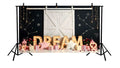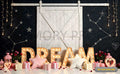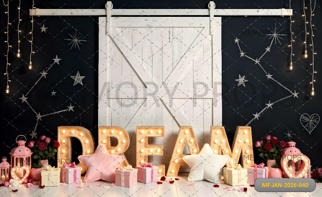 Create a magical and cozy setup with this dream-inspired romantic backdrop, featuring a white rustic sliding barn door set against a deep black night-sky wall adorned with sparkling constellation-style stars. Warm hanging fairy lights add a soft glow, while illuminated marquee “DREAM” letters bring a whimsical, storybook feel to the scene.