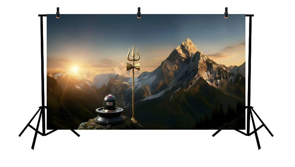 A spiritually evocative printed backdrop featuring a sacred Shiva Linga, radiating divine energy and serenity. The Linga is beautifully illuminated with soft, celestial lighting, surrounded by subtle sacred elements and an aura of devotion. The composition conveys peace, power, and spiritual purity, creating a meditative and reverent atmosphere. Ideal for temples, devotional events, stage décor, meditation spaces, and spiritual photography, this high-resolution backdrop offers a timeless and sacred visual experience.