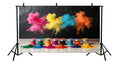 DRAMATIC HOLI POWDER EXPLOSION WITH COLORFUL GULAL JARS AND BLACK TEXTURED WALL - PRINTED BACKDROP