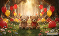 This high-quality studio background, categorized under Studio Backgrounds in Lighting & Studio, features a sun-drenched enchanted forest scene. The setting includes two cuddly teddy bears sitting in a lush meadow filled with colorful wildflowers, surrounded by vibrant red and yellow balloons floating among the trees. It is a perfect choice for children's birthdays, spring-themed portraiture, or whimsical "Teddy Bear Picnic" mini-sessions.