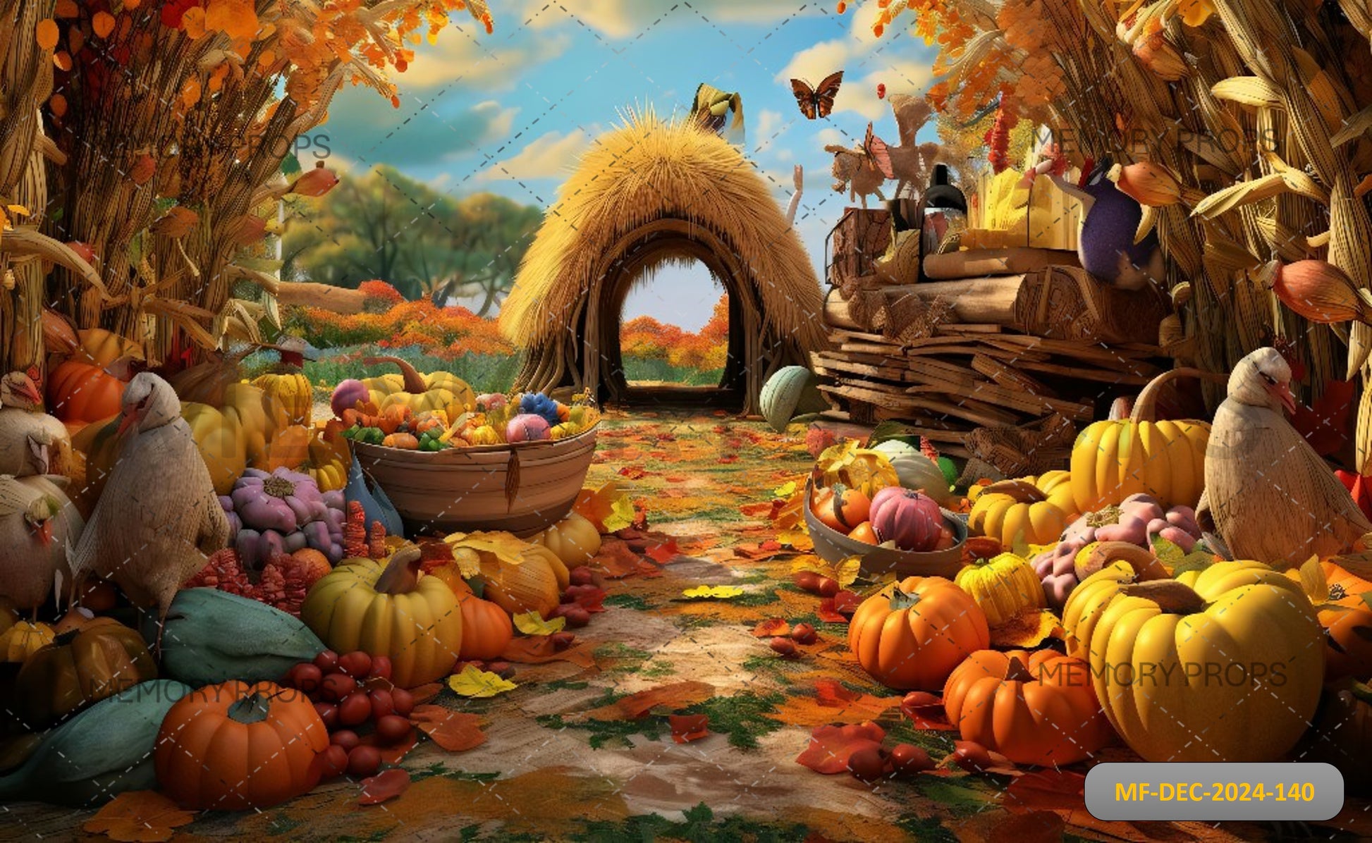 Celebrate the harvest season with this warm, rustic backdrop featuring pumpkins, autumn leaves, and cozy fall tones — ideal for seasonal portraits and festive photo sessions.