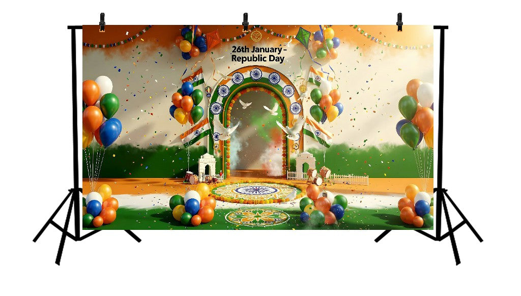 A vibrant printed backdrop celebrating India’s Republic Day with a festive and patriotic theme. Elements inspired by the Indian tricolour create a lively and proud atmosphere, symbolizing unity, freedom, and national spirit. Dynamic lighting and celebratory detailing add energy and depth to the scene. Ideal for Republic Day functions, school programs, stage décor, cultural events, exhibitions, and patriotic photography, this high-resolution backdrop captures the joy, pride, and essence of the nation’s celebration.