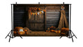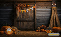 Step into a cozy autumn night with this rustic Halloween backdrop, featuring a weathered barn door surrounded by glowing pumpkins. Carved jack-o’-lantern smiles, soft candlelight, and scattered fall leaves create a warm yet spooky atmosphere perfect for festive celebrations.