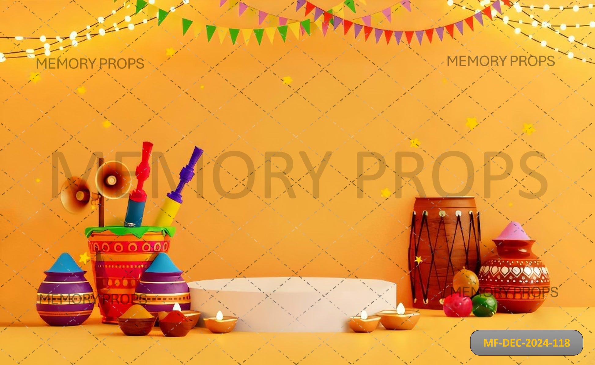 A vibrant explosion of colours inspired by the festival of Holi, featuring dynamic splashes of pink, blue, yellow, and green. Perfect for lively celebrations, festive photo shoots, and joyful party decor.