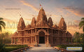 A serene and spiritual backdrop inspired by traditional Indian temple architecture, set against a radiant sunset sky. The design features the soft glow of golden and orange hues reflecting across the temple’s stone columns and domes, symbolizing purity, devotion, and tranquillity.