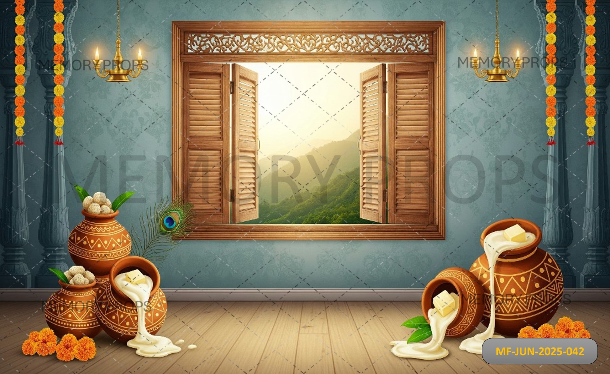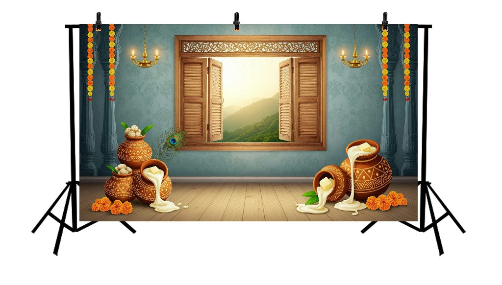 Celebrate the playful charm of little Krishna with this vibrant backdrop, showcasing the beloved Makhan Chor (Butter Thief) in action — surrounded by traditional pots, village textures, and a scene full of joy, mischief, and devotion. Perfect for Janmashtami celebrations, temple events, and Krishna-themed photo shoots that capture the essence of his childhood leelas.