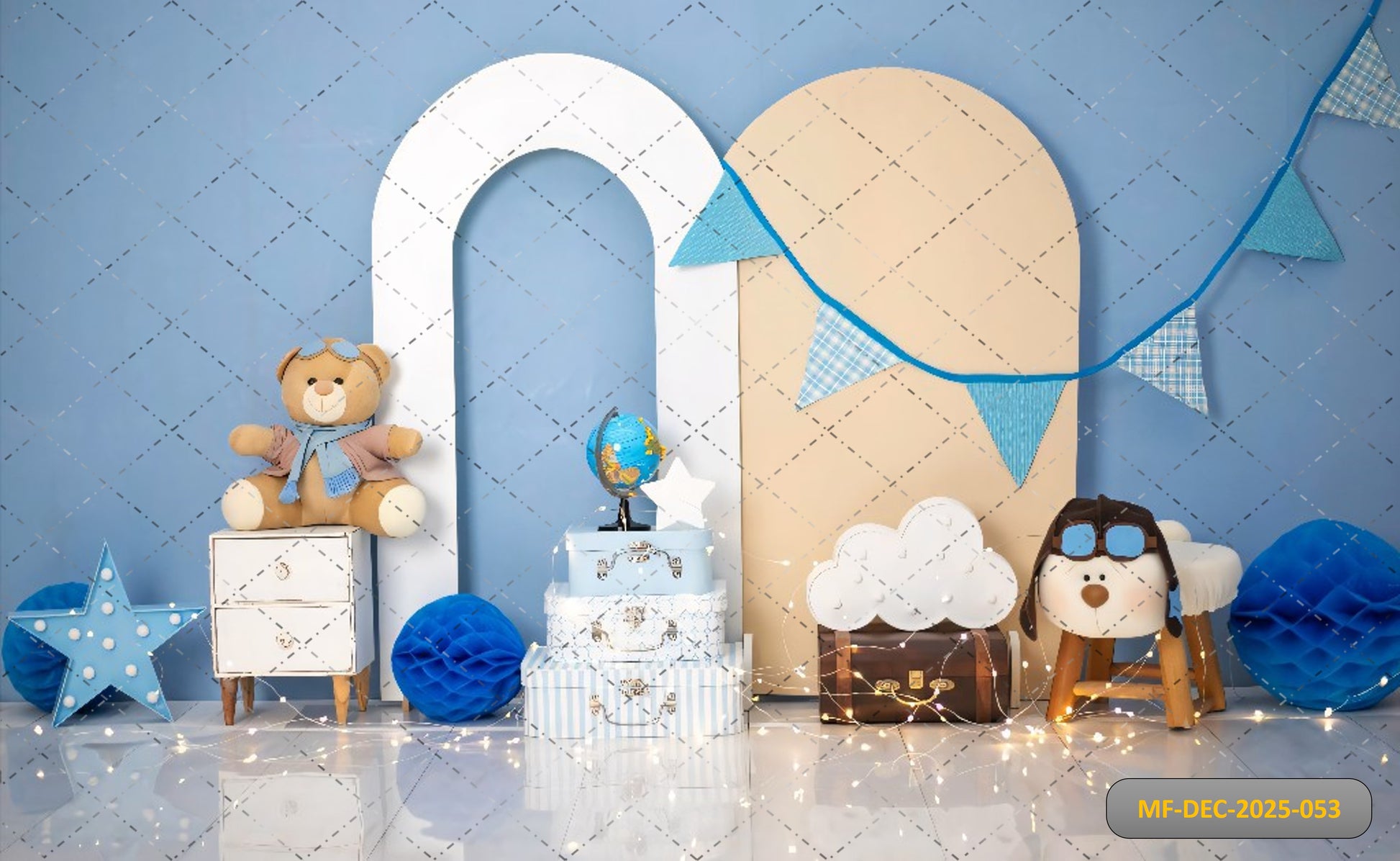 Create an adorable and adventurous celebration setting with the Little Pilot Blue Backdrop with Teddy Bear and Vintage Suitcases Printed Backdrop. Featuring a charming blue aviation theme, a cute teddy bear dressed as a pilot, and stacked vintage suitcases, this backdrop brings sweet travel-inspired charm to your event. Perfect for first birthdays, baby showers, kids’ parties, and aviation or travel-themed photo shoots, it’s printed in high resolution with soft colours and delightful details for heart-warming, picture-perfect memories.